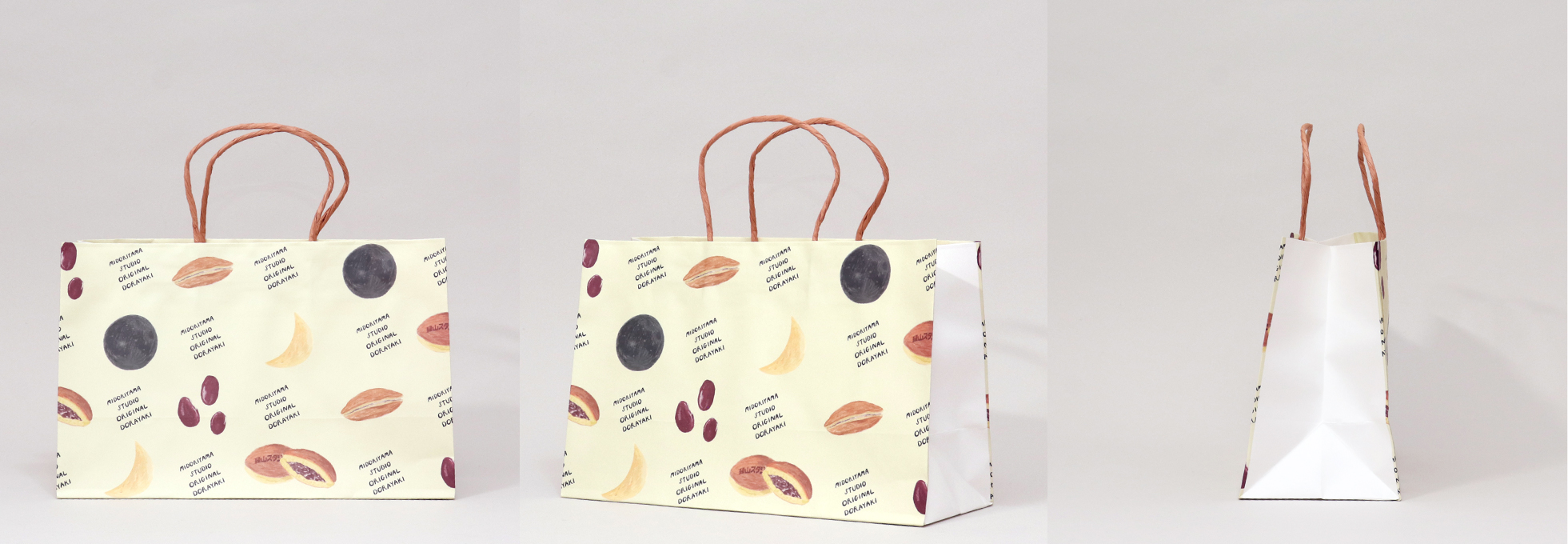 スタジオ様と有名和菓子店でコラボしたオリジナルどら焼きを、スタジオ内のマルシェで販売されていらっしゃいます。 手書きの可愛らしいイラストは、商品の包み紙とお揃いのデザインです。 高さを正面よりも110mmほど低くし、どら焼きの箱が取り出しやすい横長タイプの形状にしています。 中に入れるものが大きくないのであれば、高さはそこまで必要ありませんよね。持ち歩きやすいスマートな形状です。