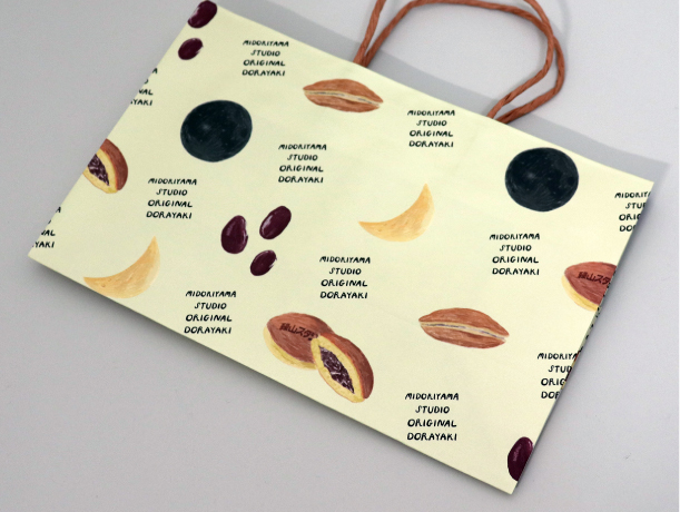 神奈川県にあるテレビスタジオ様に発注いただいた紙袋です。スタジオ内で販売されているどら焼きの紙袋です! 規格サイズ320に限りなく近い大きさですが、マチ10mmの差にこだわられてジャストニーズプランで製作しました。 高さを低くしたことで横長タイプとなっています。
